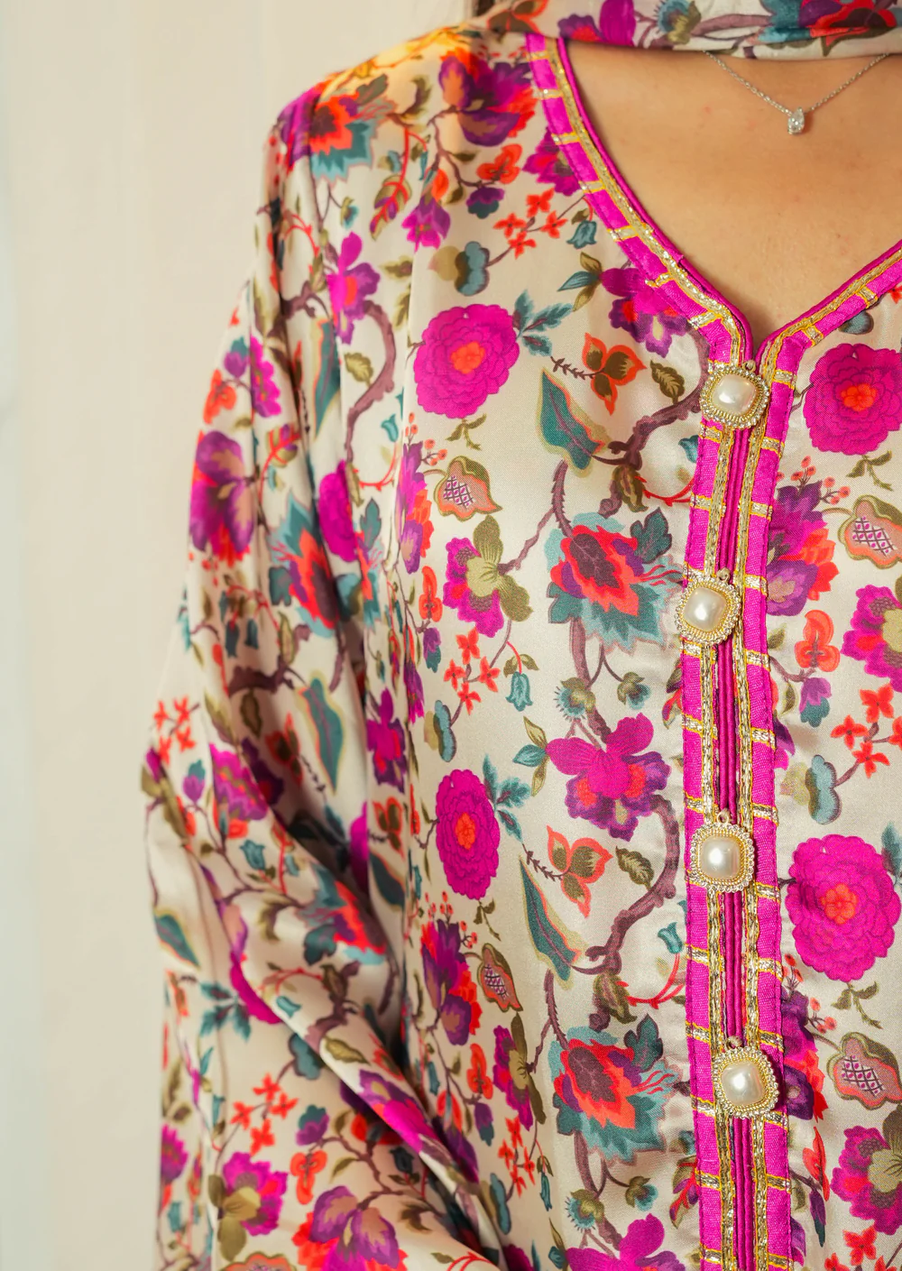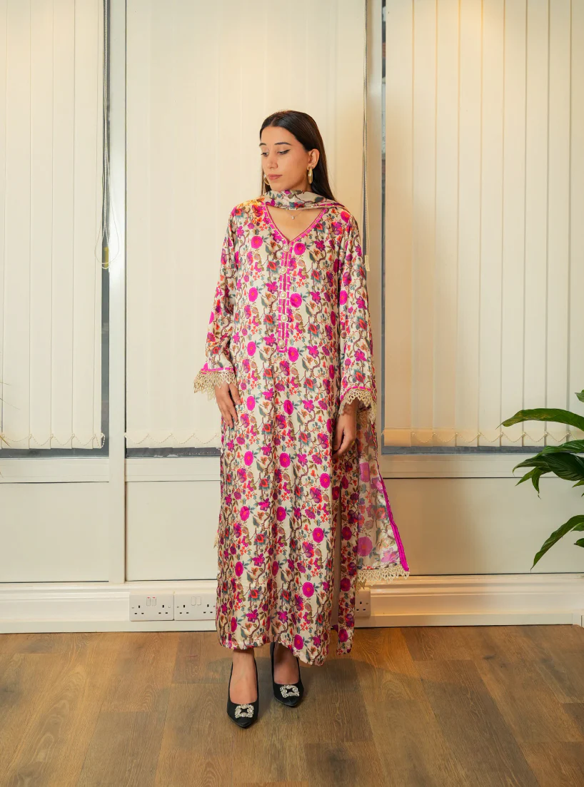A timeless three-piece ensemble crafted for refined elegance. The pure 80g silk shirt features delicate organza and sequins detailing, paired with a luxurious pure 60g silk dupatta with intricate finishing. Complemented by soft viscose culottes, this outfit blends sophistication with comfort for any formal or intimate occasion.