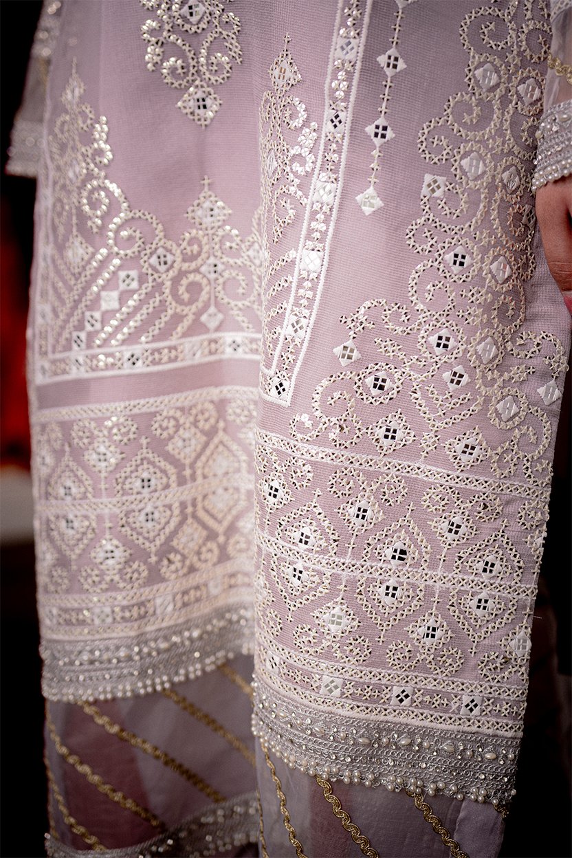 A graceful lilac ensemble featuring white threadwork embroidery, delicate mirror accents, and a sheer dupatta with gold-striped borders and lace detailing. Complete with straight trousers.