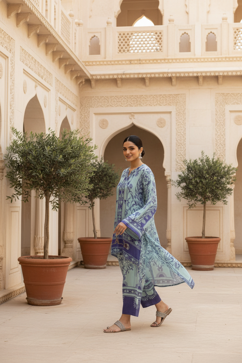A classic ebony and pearl white oriental print emboldens a crepe co-ord set for the sophisticated woman who doesn’t shy away from standing out. The collared neckline and cuffed sleeves pronounce the vividness of the attire.