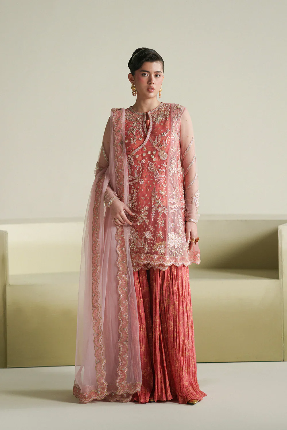 A graceful coral angrakha adorned with intricate embroidery and hand embellishments, paired with screen-printed crushed pants and a contrasting net dupatta for an elegant festive look.