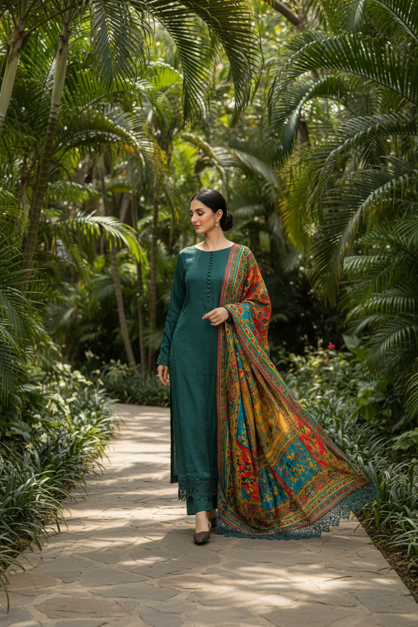 Paired with matching trousers and a striking printed dupatta, rich in jewel tones and finished with coordinated lace edging, this look balances sophistication with artistic flair.