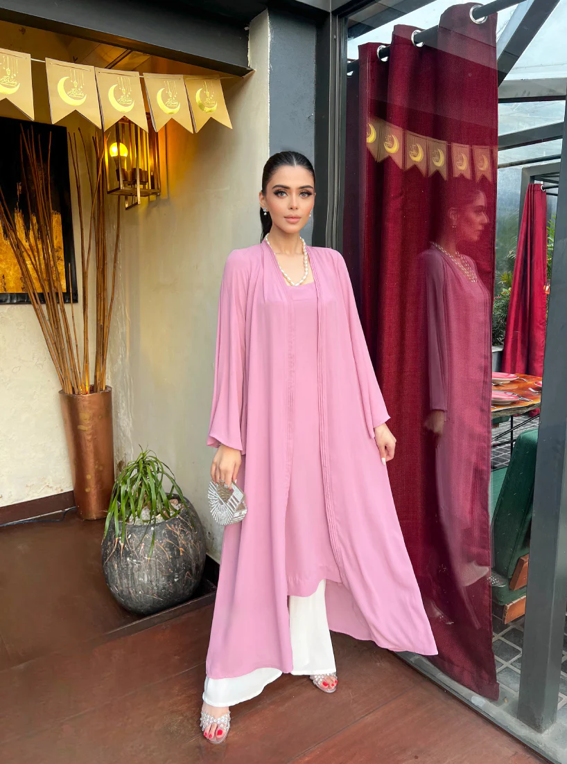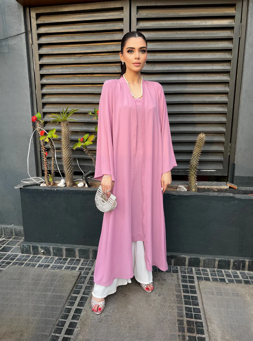 A summer essential crafted from pure crepe. The open kaftan features hand-stitched pleats and a teardrop pearl neckline inner, paired with flared white pants. Lightweight, wrinkle-free, matte, and effortlessly flattering.