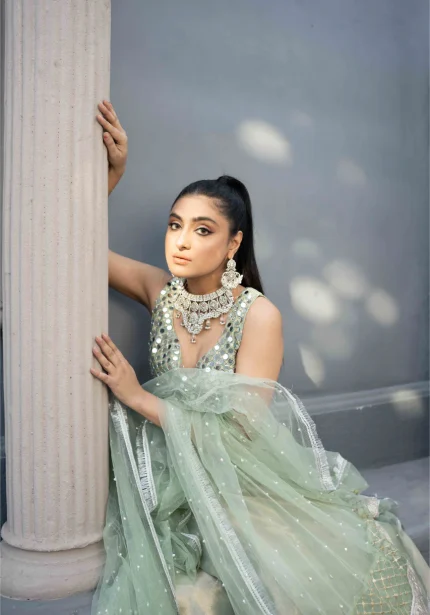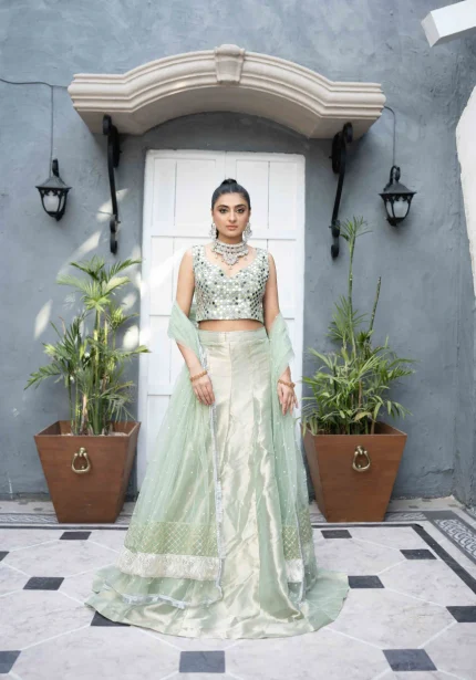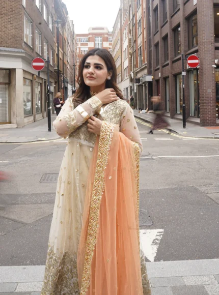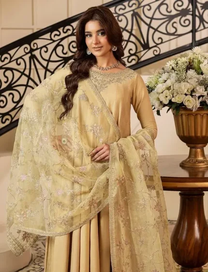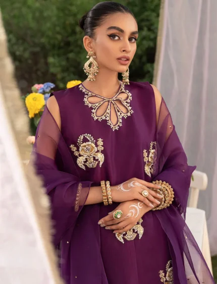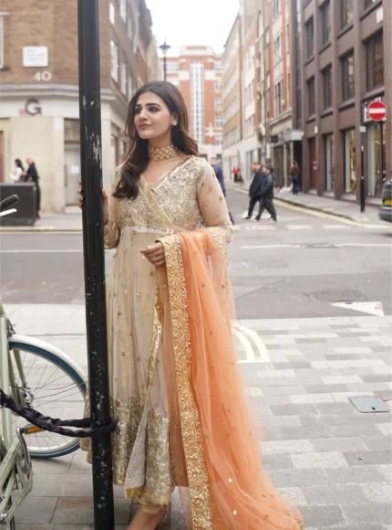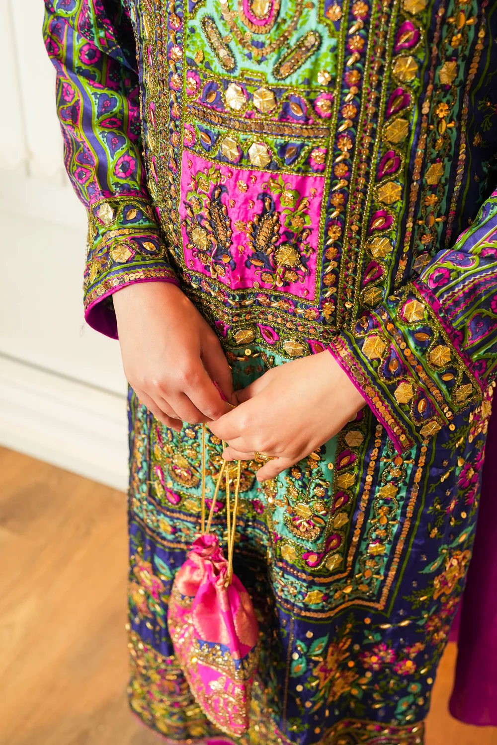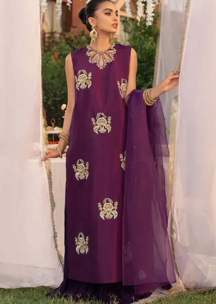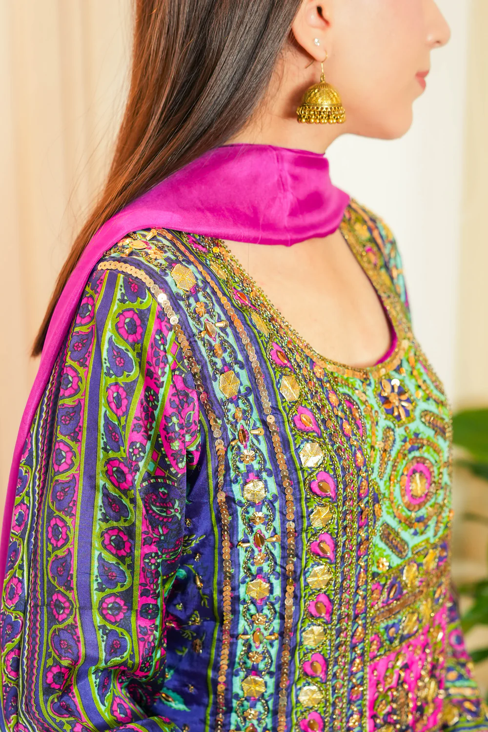 A stunning hand-embellished pure silk block-printed kameez enriched with gotta, tilla, and zardozi artistry. Paired with a matching pure silk dupatta and trouser, this timeless piece radiates traditional luxury.