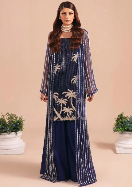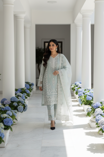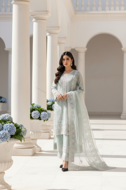 - A 4 pcs bottle green shirt adorned with stunning gotta and mukash embroidery all over the shirt, paired mukash embellished dupatta, raw silk inner and straight pants