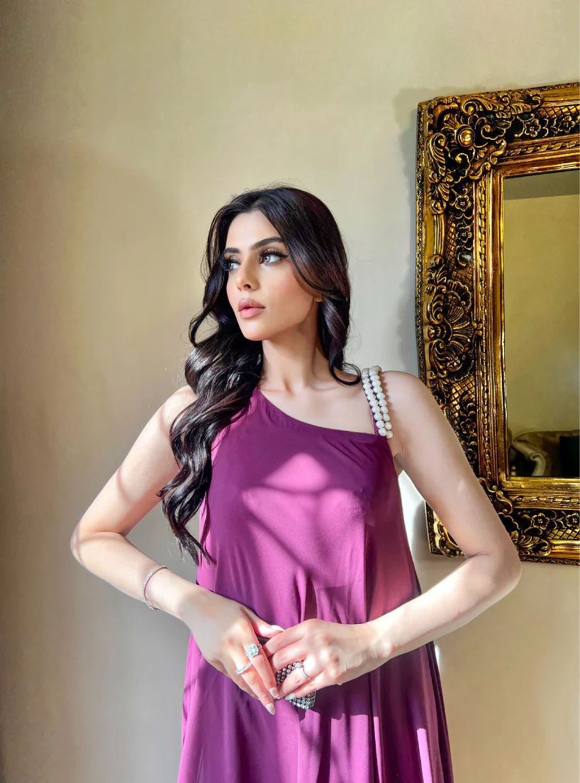 A chic plum-coloured crepe tunic highlighted with a stylish pearl-strapped neckline. Modern, minimalistic, and perfect for daily elegance.
