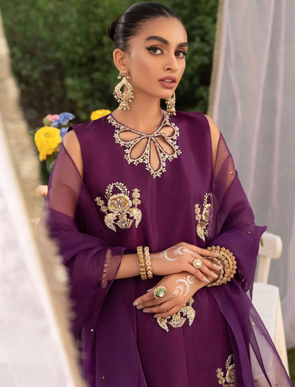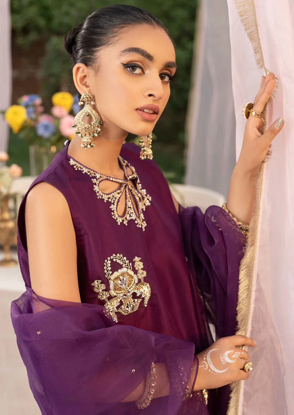 A three piece ready to wear shirt on a canvas of dark lavender, heavily embellished motifs and neckline details paired with organza dupatta and sharara.
