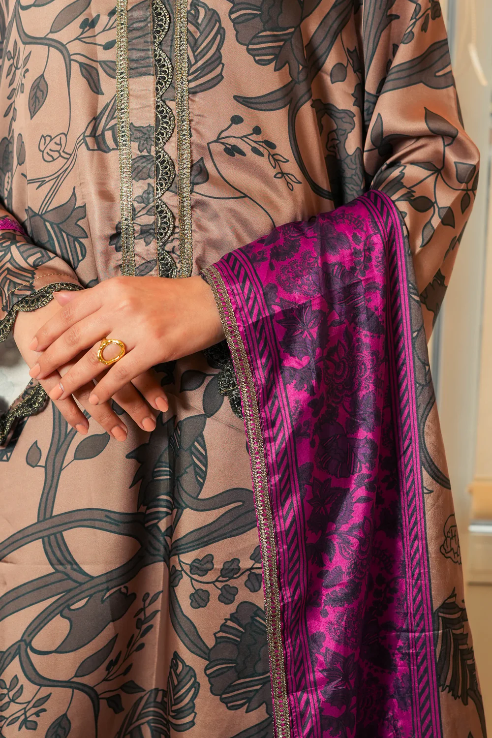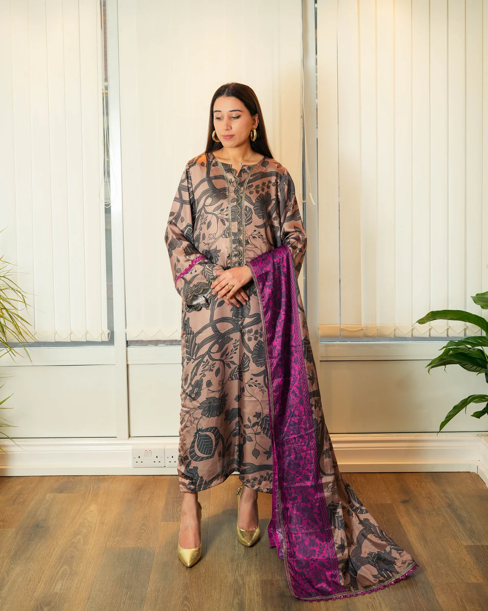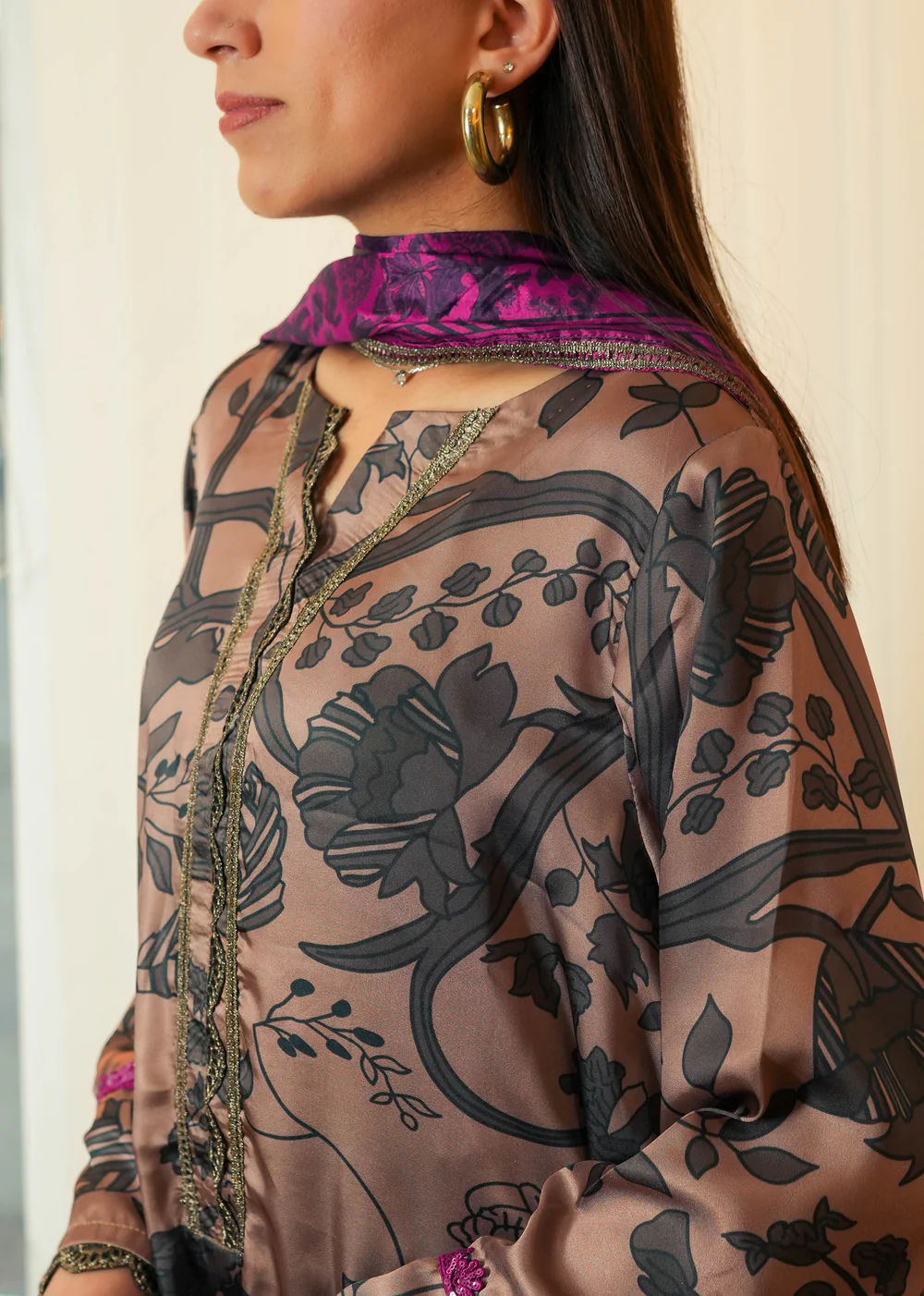 A beautifully detailed two-piece set featuring organza and sequin embellishments on pure 80g silk. Paired with a pure 60g silk dupatta and viscose culottes, offering a perfect mix of modern glamour and timeless charm.
