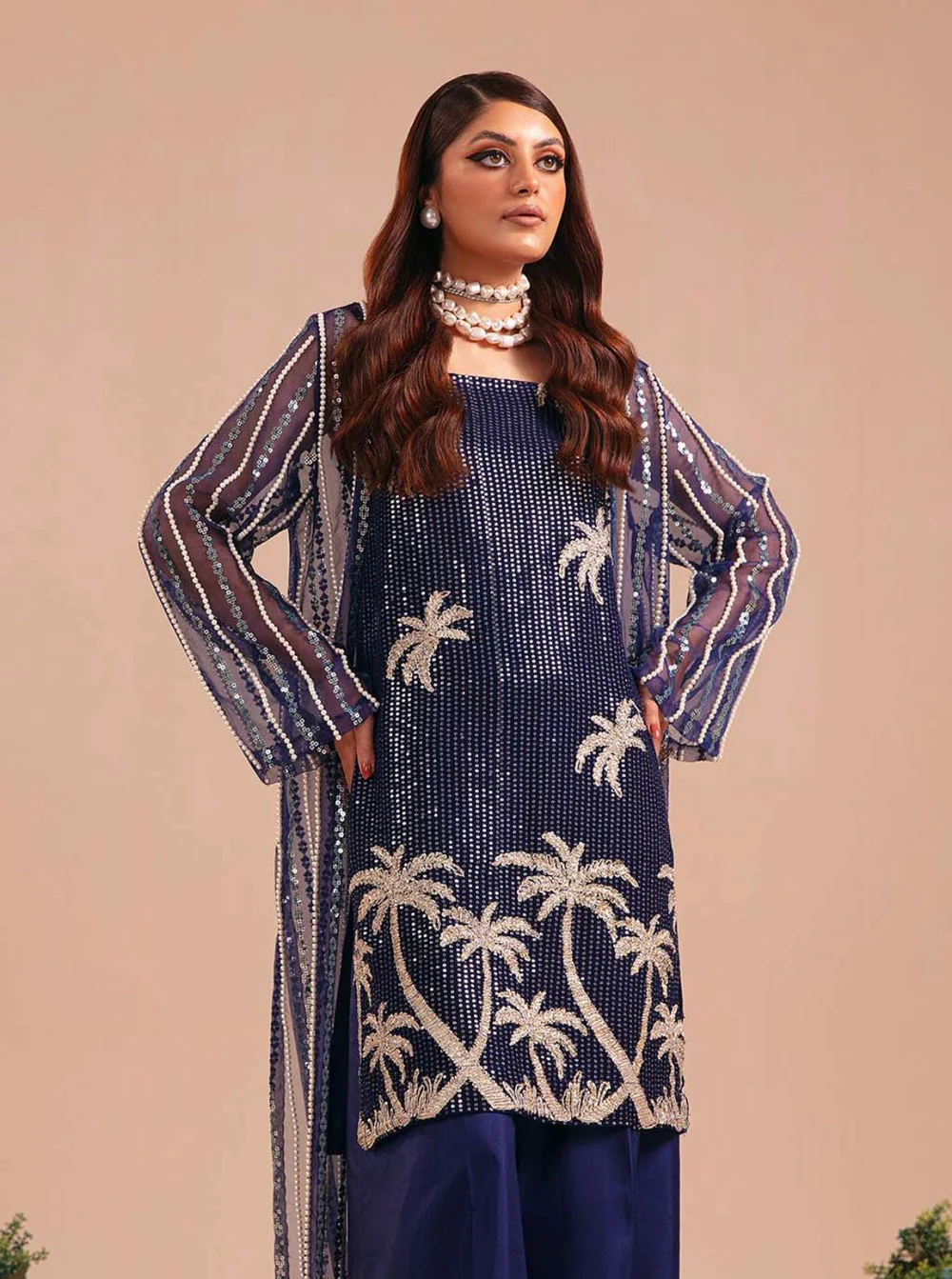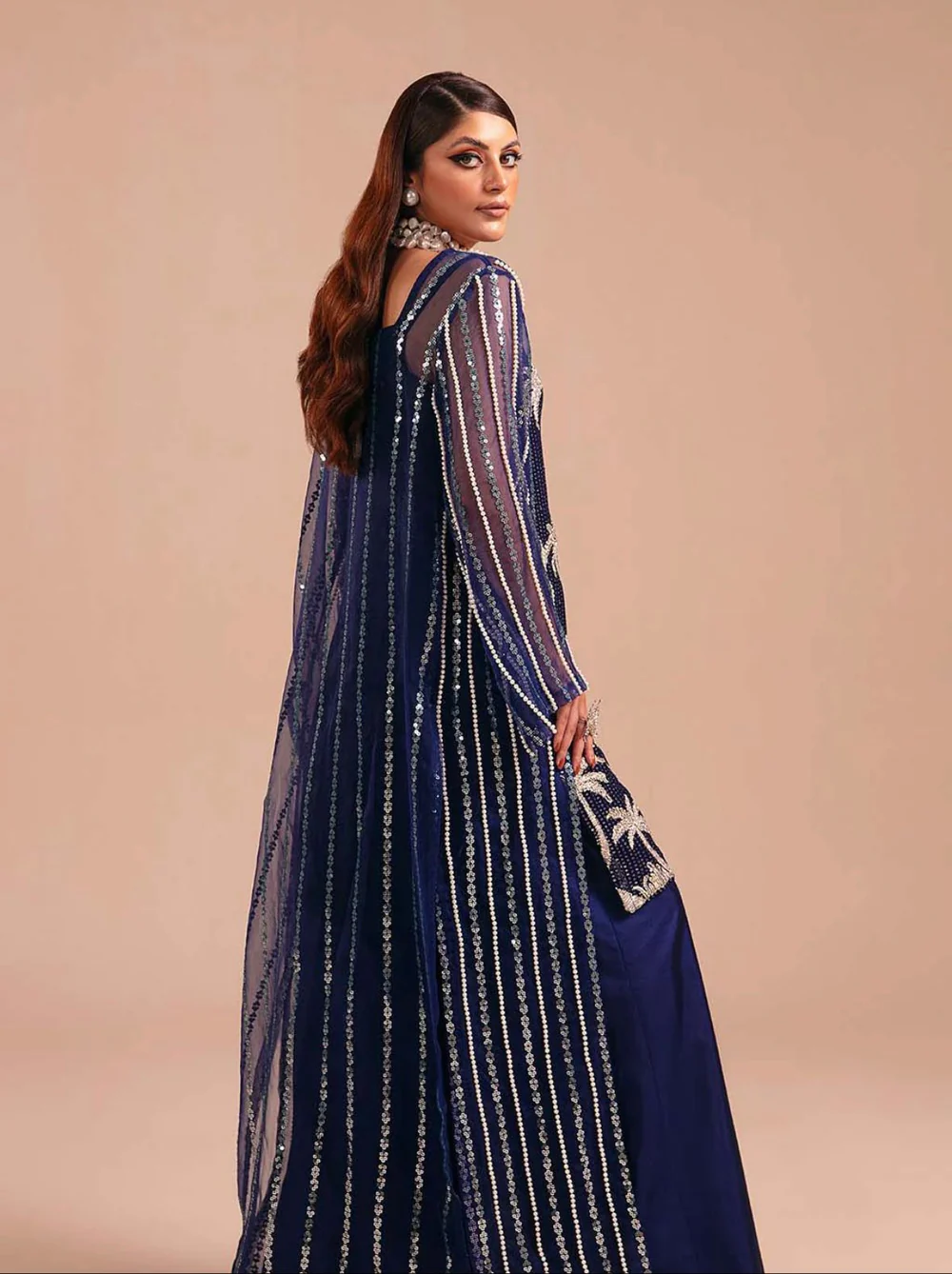 Long front open jacket with handwork and sequin paired with sequinned inner shirt with flared pants.
