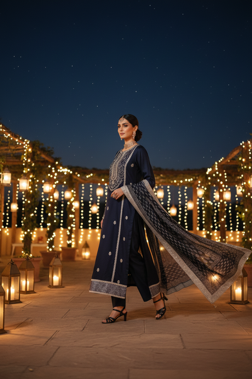 Timeless sophistication meets effortless elegance in Midnight Noor. Crafted in a deep navy blue hue, this refined ensemble is designed for women who appreciate understated luxury with intricate detailing.