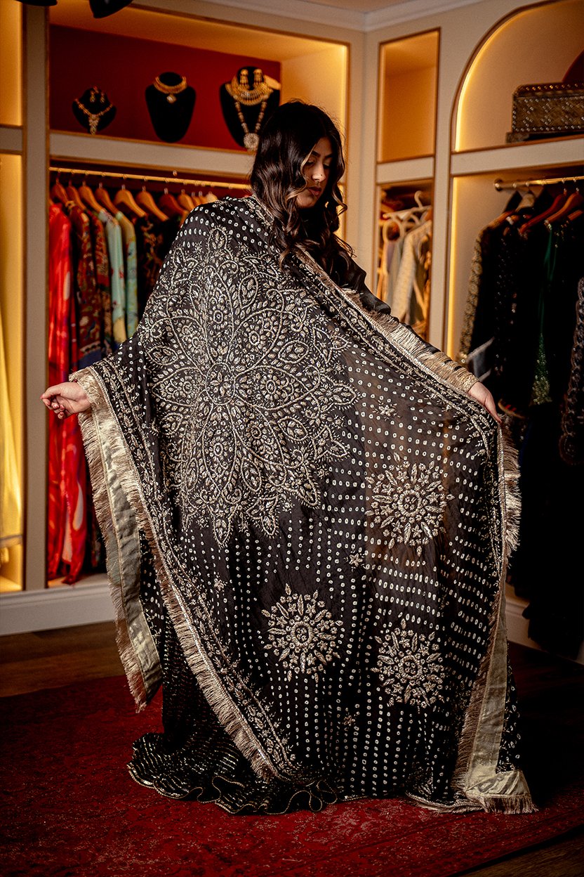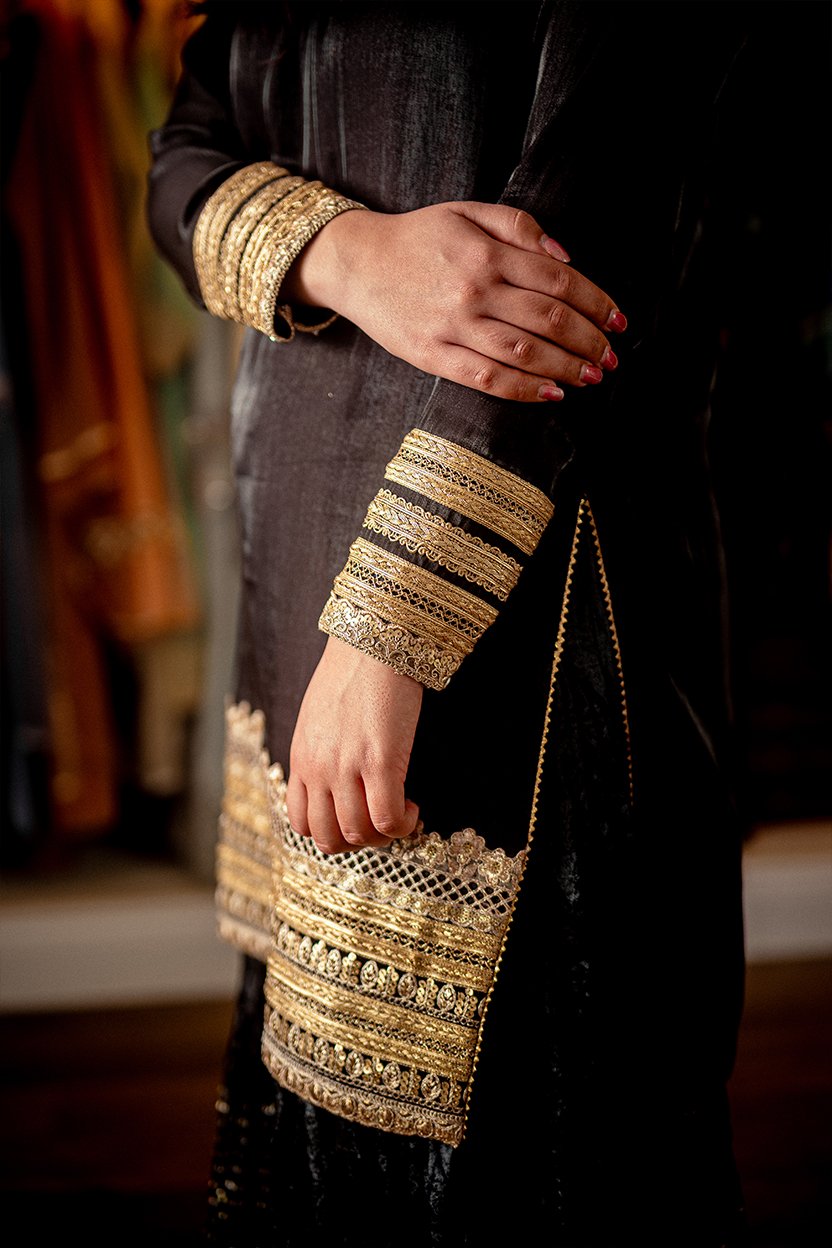 A sleek black silk tunic paired with sharara, highlighted by bold gold-banded embroidery. The look is elevated by a majestic, intricately patterned bhawalpuri dupatta heavily embroidered with gold gota.