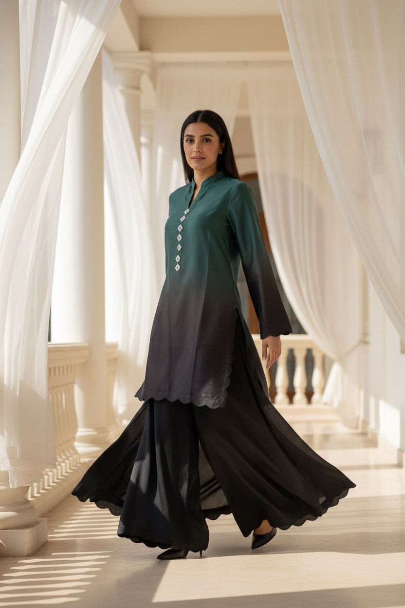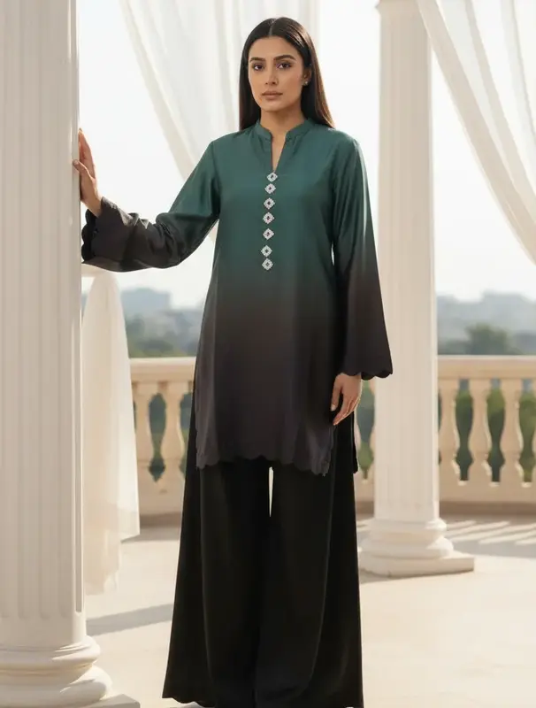 Refined simplicity. This two-piece set pairs a unique dip-dyed silk tunic with flowing wide-leg trousers. Designed for comfort without compromising on style.