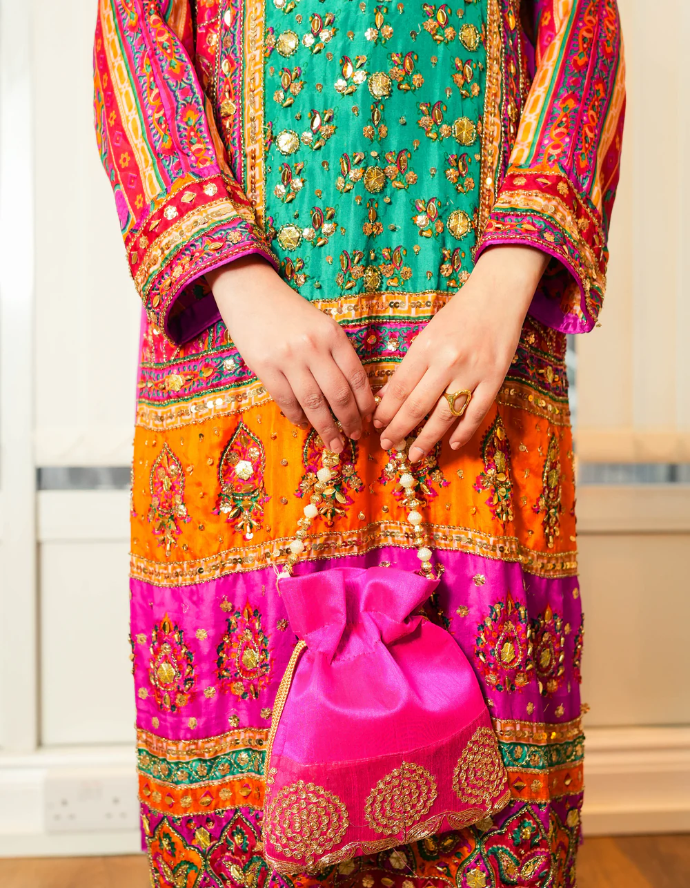 Exquisitely block-printed and hand-embellished with gotta, tilla, and zardozi, this pure silk three-piece ensemble embodies classic artistry and rich tradition.