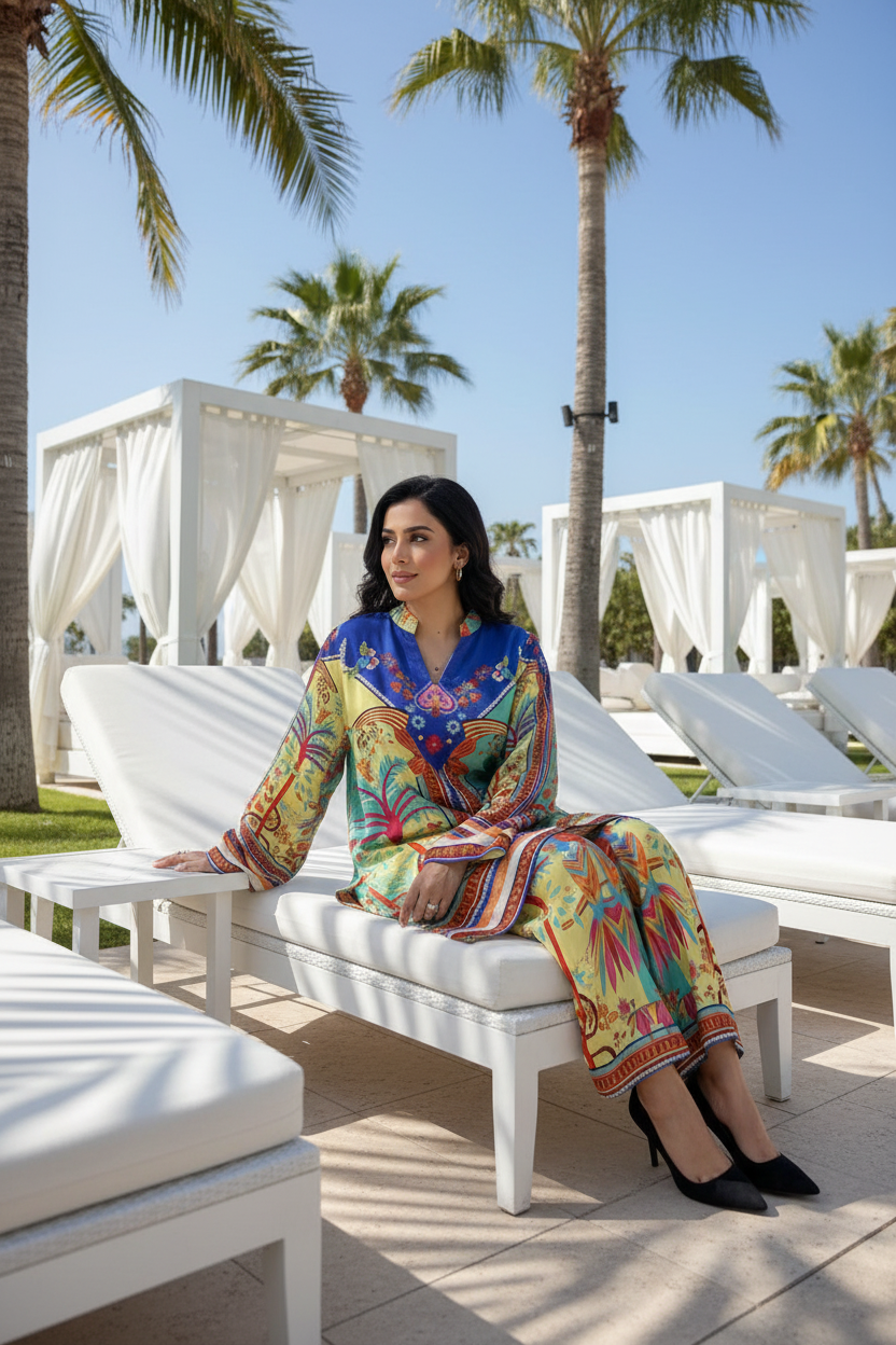 A striking ode to playful artistry, this crepe ensemble is bathed in vibrant azure, calming aquamarine, and pale yellow tones, with azure fringe accents on the flowing sleeves. The relaxed top, adorned with a botanical print and avian accents, drapes effortlessly, exuding bohemian elegance. It pairs beautifully with matching culottes featuring a vibrant tropical print. Model height: 5’8 Length: 32 Cut: Relaxed Fit Design may vary slightly from the display images. A variation in size of +/- 2 inches is considered within an acceptable tolerance.