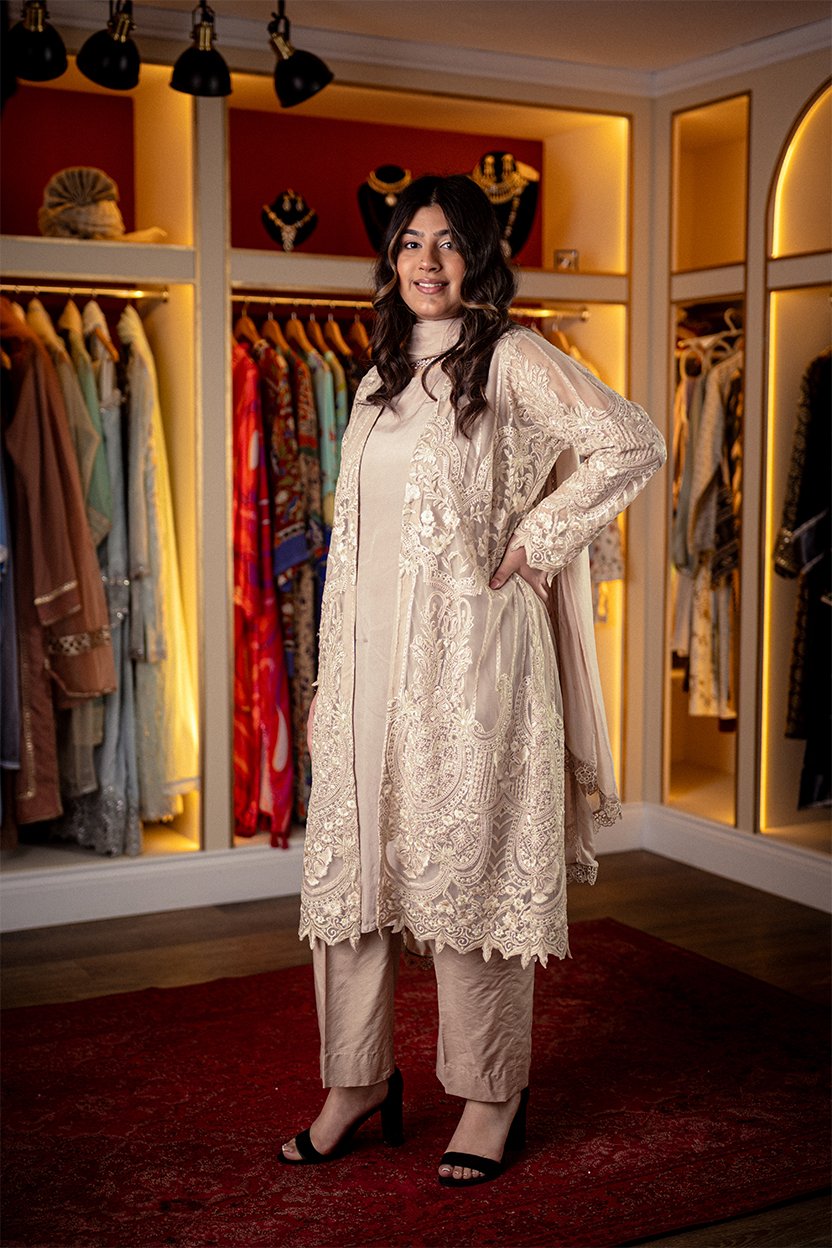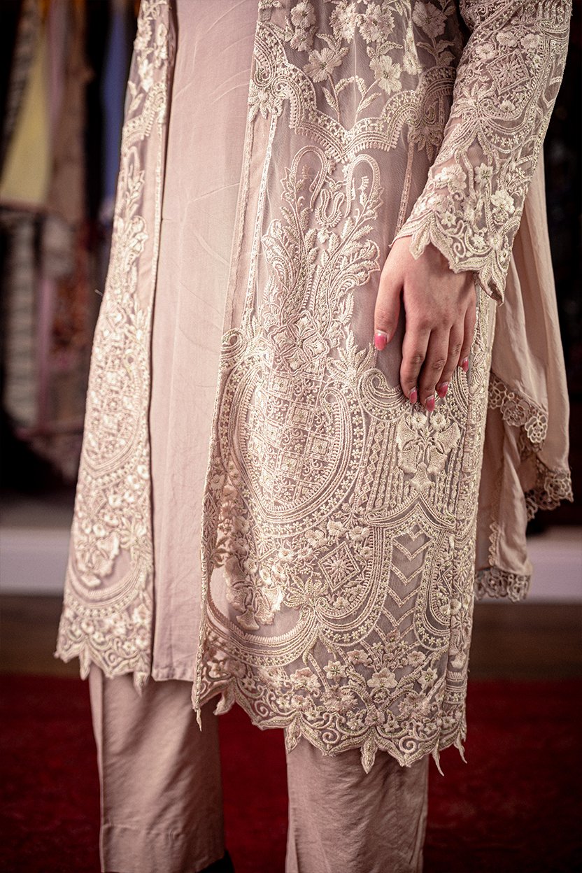 sophisticated beige ensemble featuring a floor-length sheer overlay with ornate tonal lace embroidery, scalloped hems, and matching straight-cut trousers.