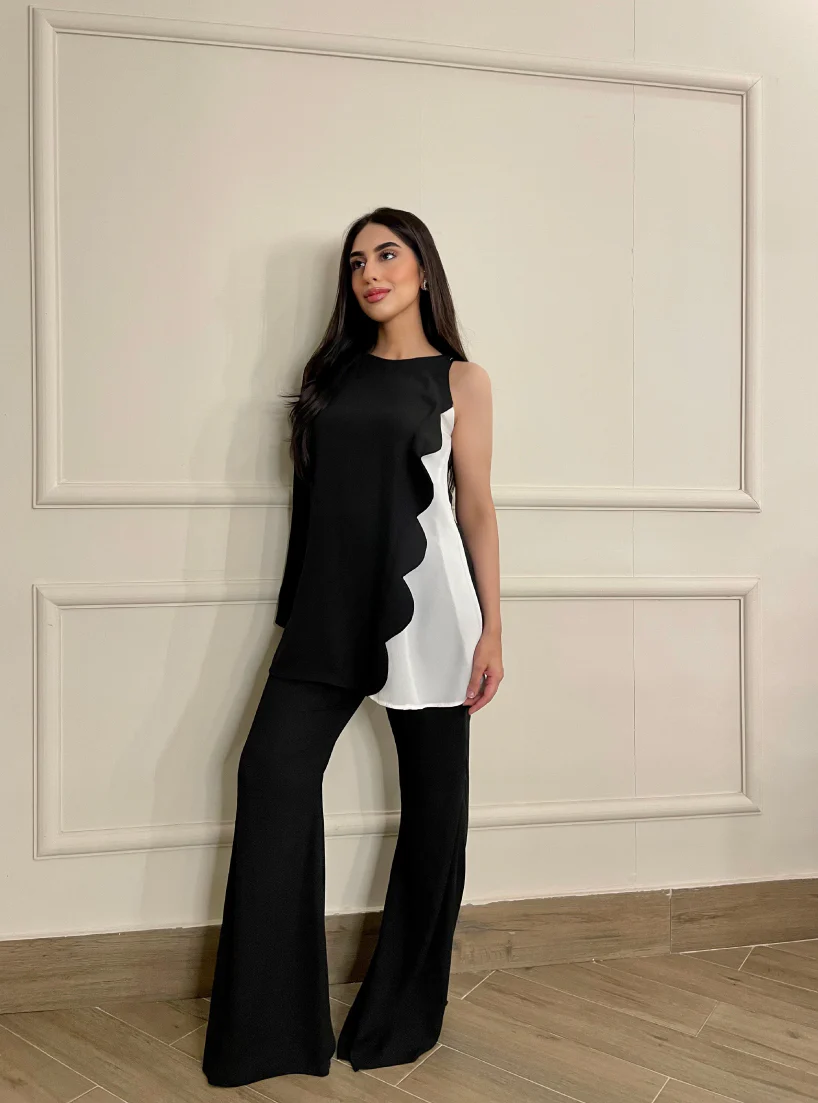 A modern crepe co-ord set featuring delicate scalloped detailing paired with black flared pants. A sleek, stylish choice for effortless everyday glam.