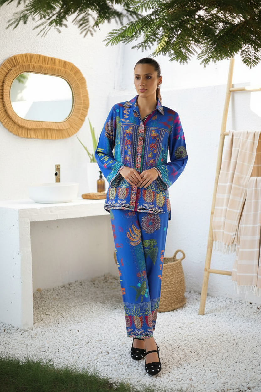 Vibrant blue co-ord set featuring intricate tropical prints, relaxed tailored shirt, straight trousers, bold colors perfect for chic spring styling.