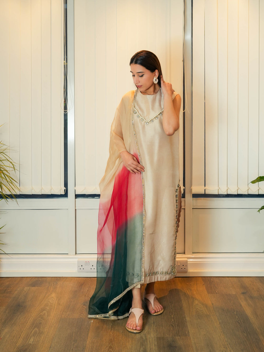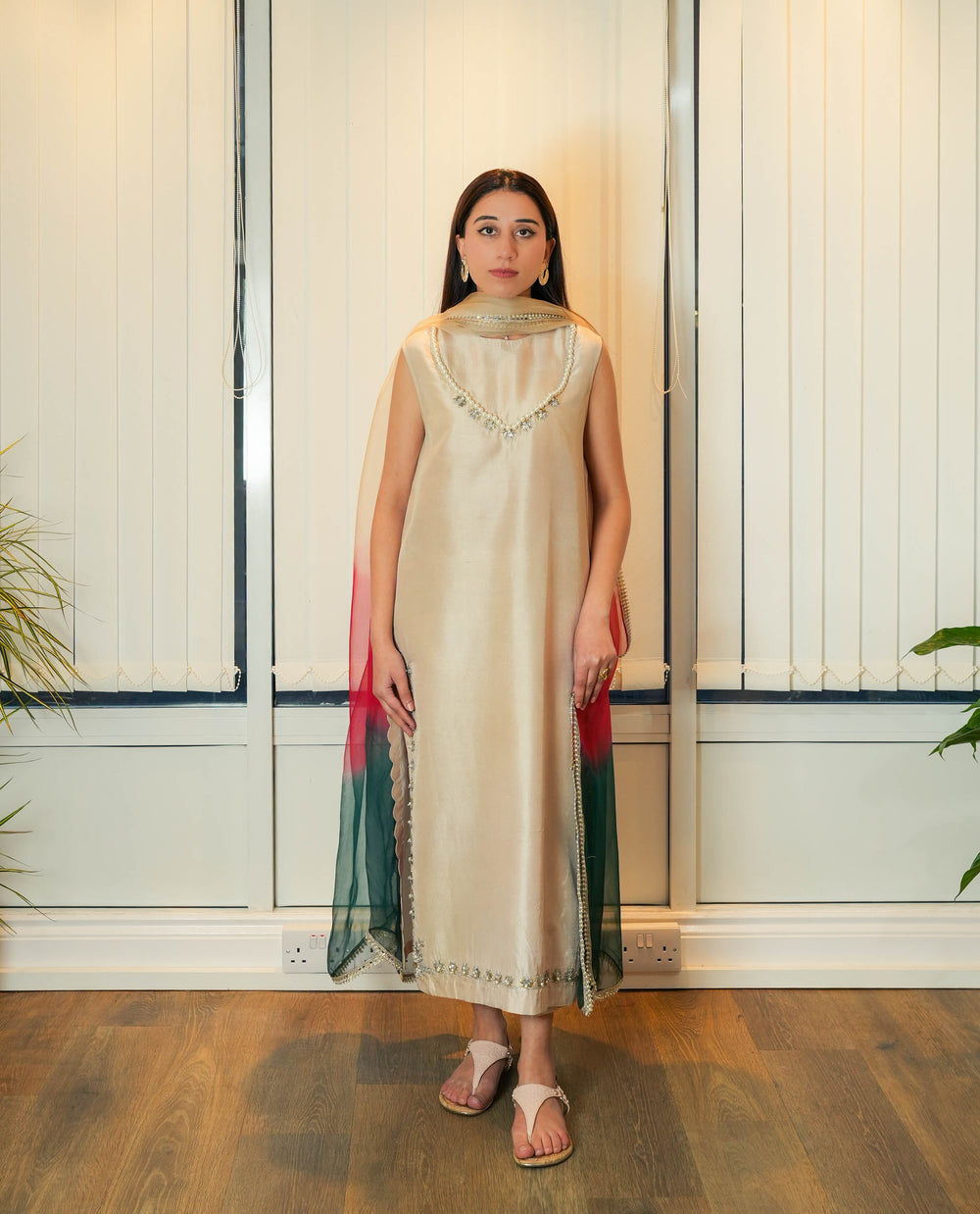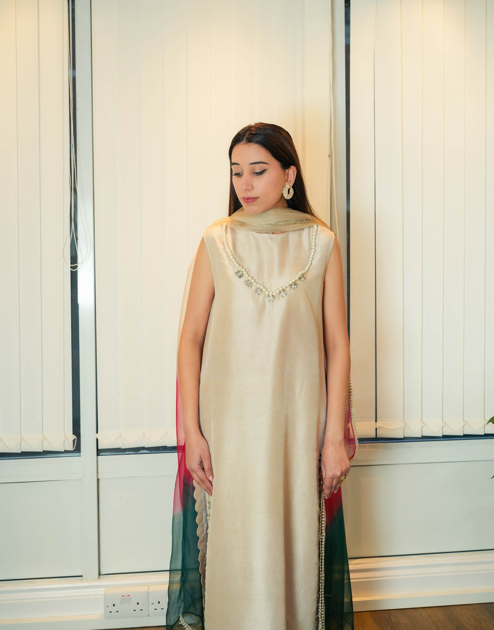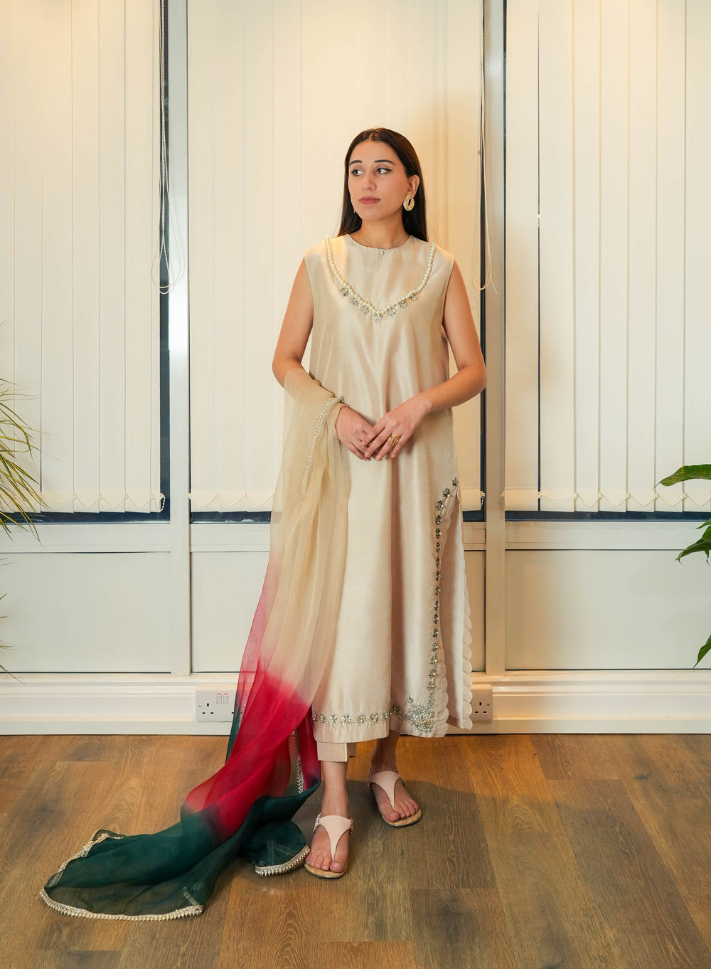 A statement outfit designed with pure 80g fused raw silk and adorned with exquisite handwork featuring pearls and zardozi. The tri-shade pure organza dupatta, embellished with handcrafted details, elevates the entire ensemble into a premium festive wear staple.