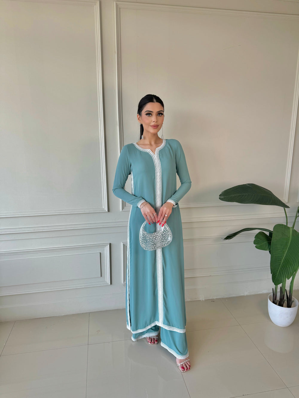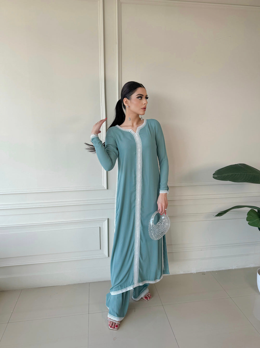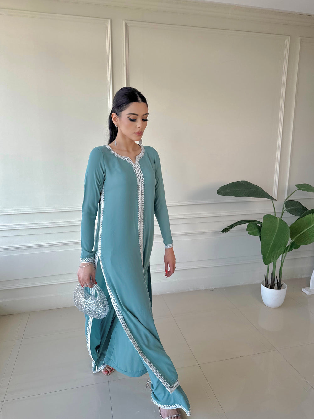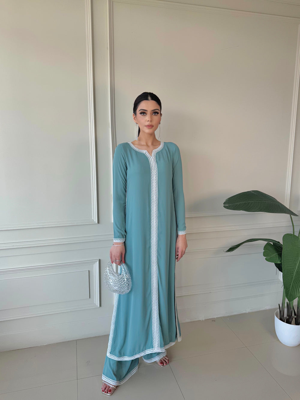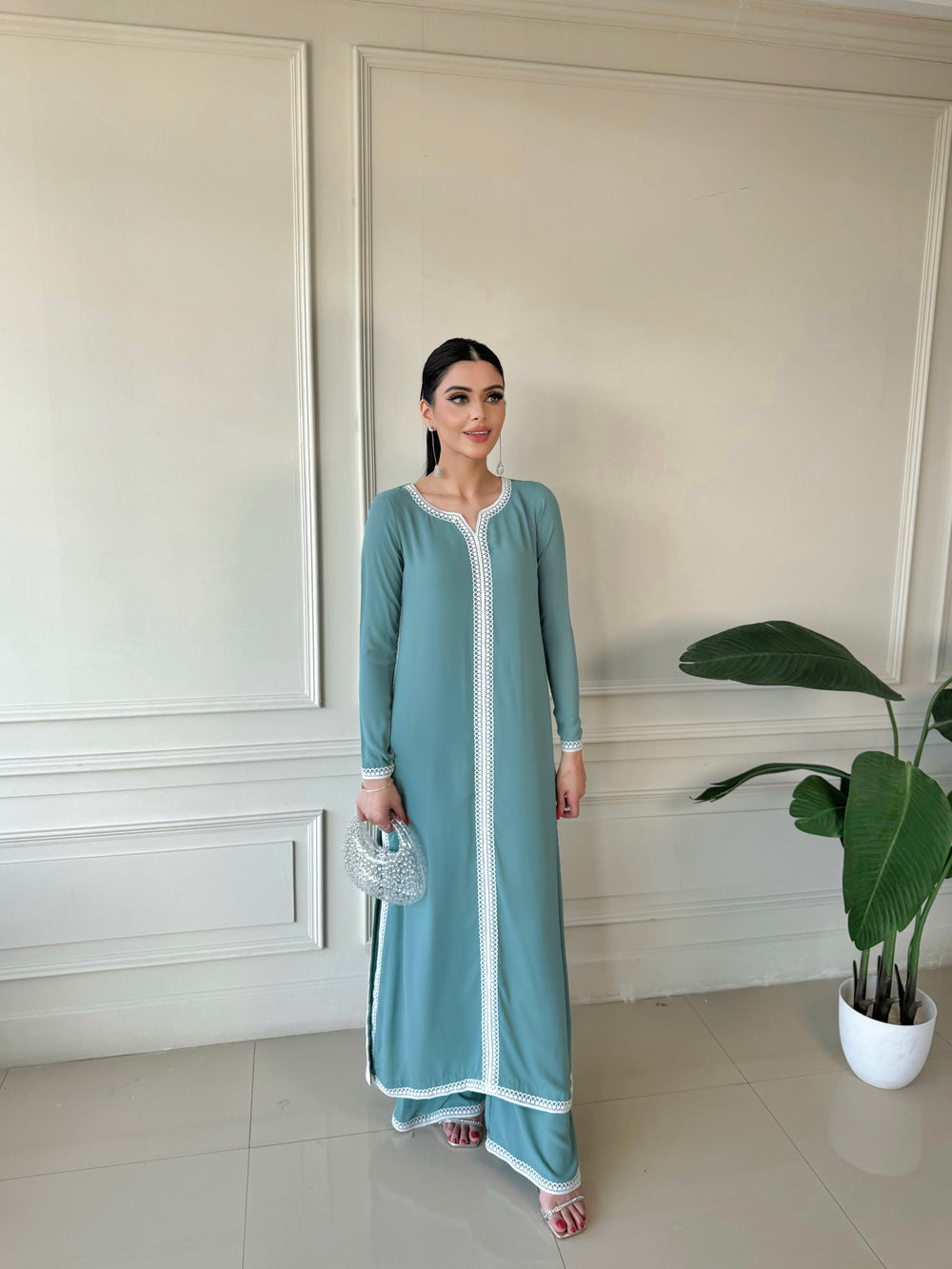 Effortless summer sophistication. This ice-blue straight long shirt crafted from premium pure crepe features a relaxed silhouette perfect for brunches and evening wear. Enhanced with resham seam details and paired with flared crepe pants, it’s the ideal breathable, chic summer fit.