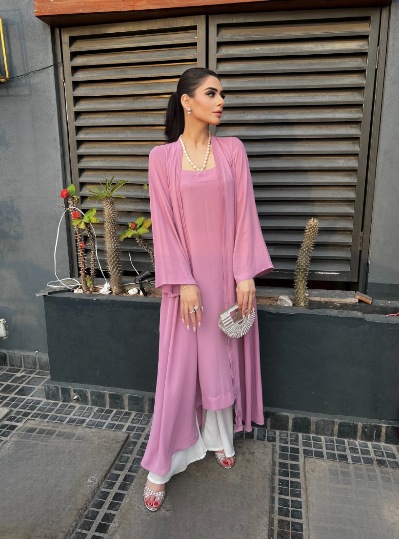 A summer essential crafted from pure crepe. The open kaftan features hand-stitched pleats and a teardrop pearl neckline inner, paired with flared white pants. Lightweight, wrinkle-free, matte, and effortlessly flattering.