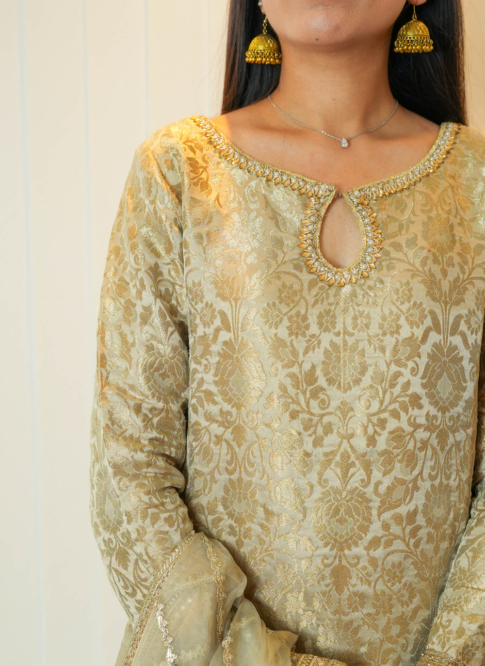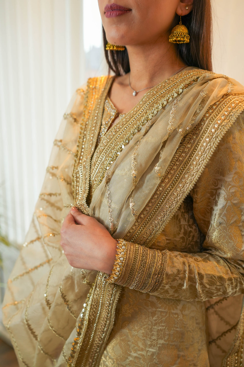 An exceptionally elegant ensemble featuring a pure Atlas kameez adorned with intricate Indian handwork. Paired with a worked organza dupatta and raw silk cigarette pants, this outfit defines graceful festive charm.