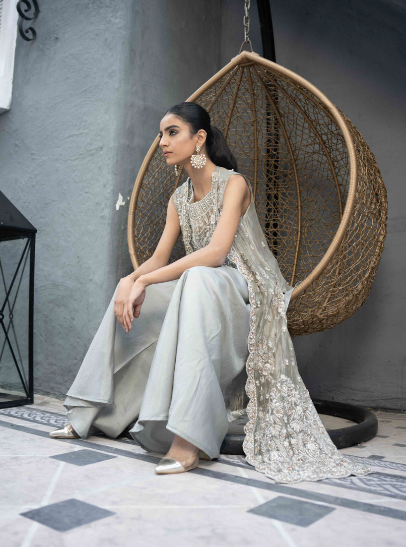 An opulent formal wear set crafted with a pure tissue front-open jacket, paired with flared dhaka pants and an intricately hand-embellished blouse. A masterpiece for grand celebrations.