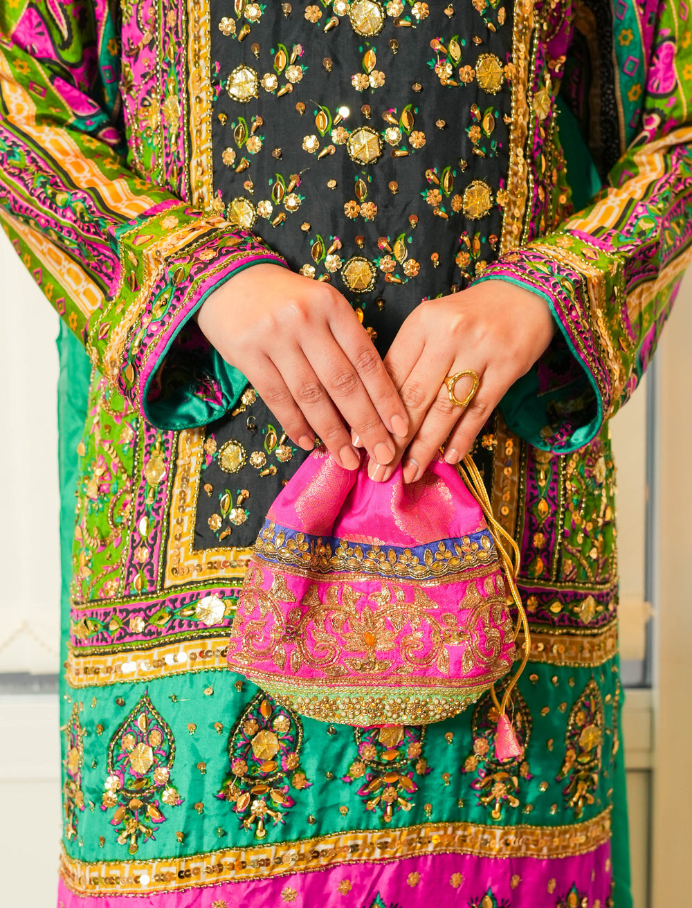 A beautifully block-printed pure silk kameez enriched with traditional gotta, tilla, and zardozi embellishments. Completed with a pure silk dupatta and matching pants for a timeless festive finish.