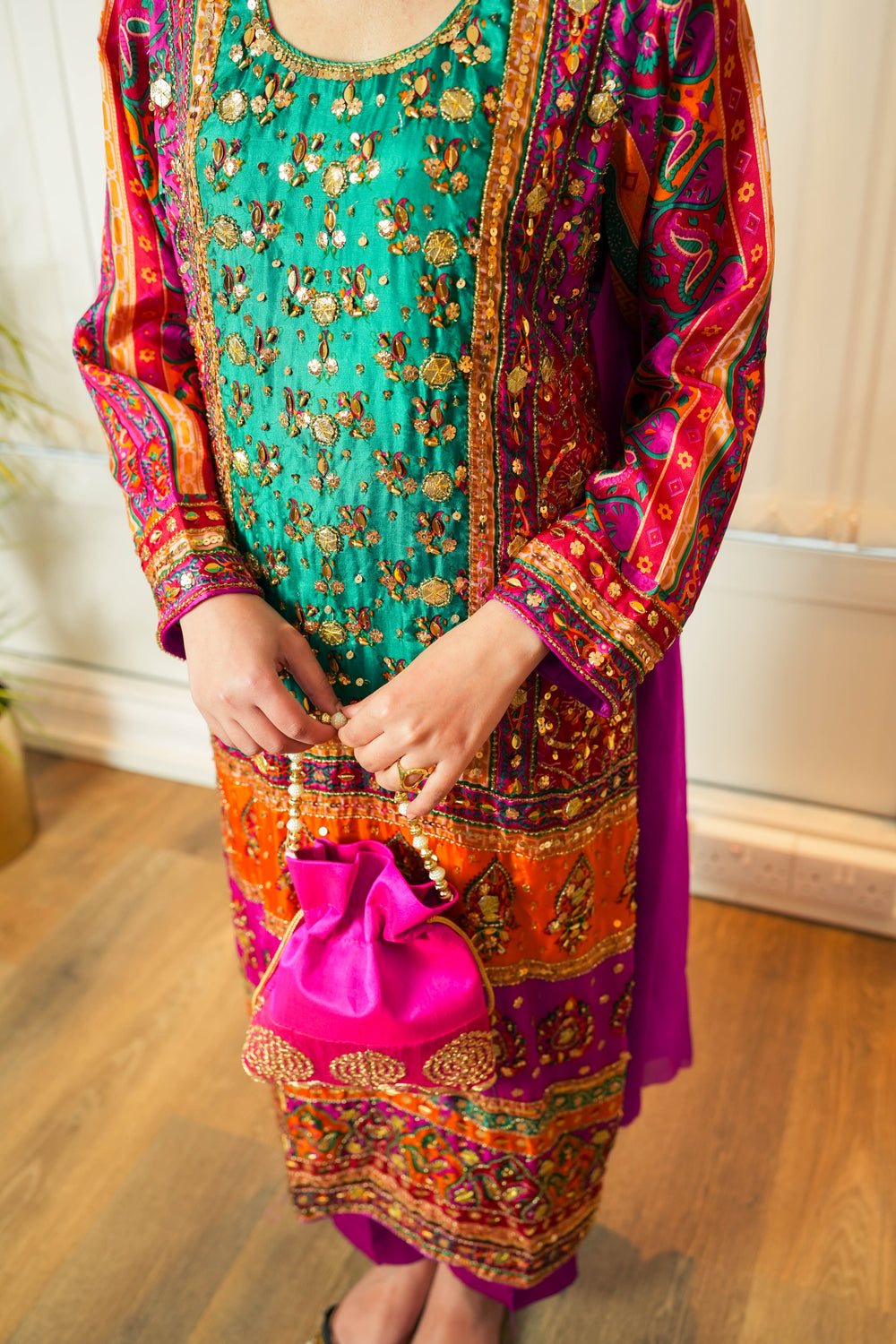 Exquisitely block-printed and hand-embellished with gotta, tilla, and zardozi, this pure silk three-piece ensemble embodies classic artistry and rich tradition.