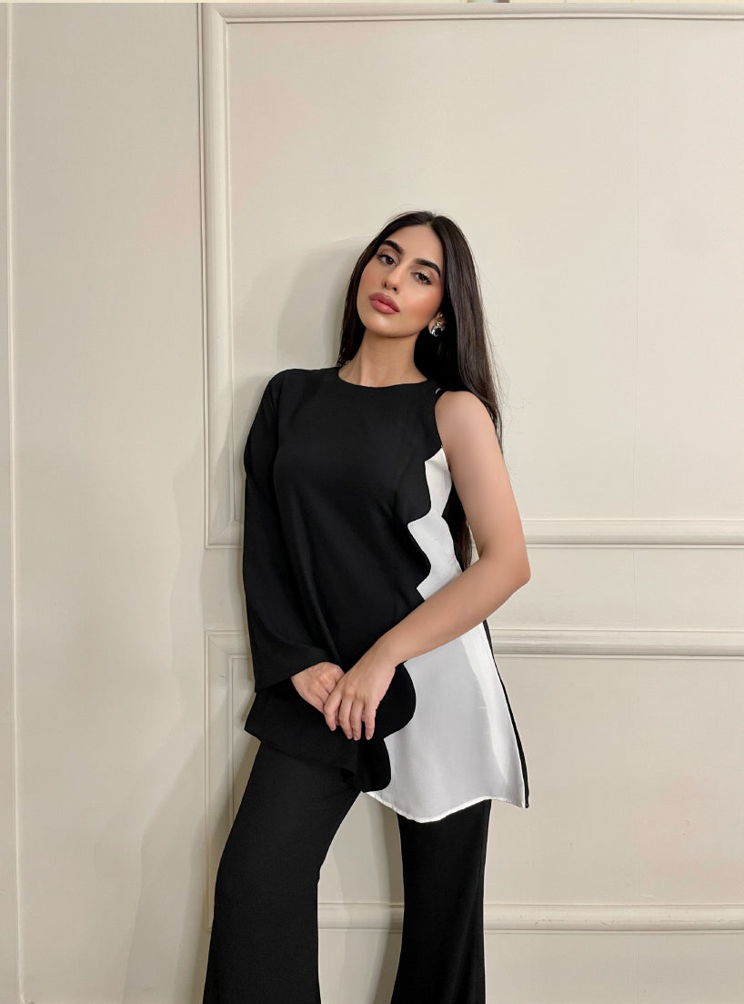 A modern crepe co-ord set featuring delicate scalloped detailing paired with black flared pants. A sleek, stylish choice for effortless everyday glam.